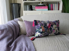 Hazeldee Home Handmade Navy Watercolour floral print cotton cushion with our trademark contrast silky double tassels detailing; a new addition to the Hazeldee Botanical Collection.