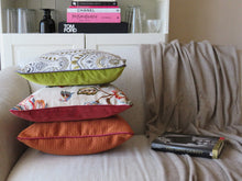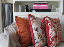 Hazeldee Home handmade double-sided cushion featuring decadent silky geometric jacquard with tones of paprika chilli with contrasting silky trim.