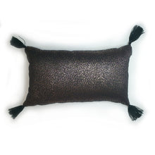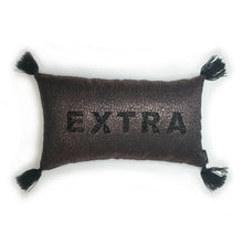 Hazeldee Home Handmade metallic black pink and gold leopard metallic jacquard cushion with black rhinestone embellished letters spelling 'EXTRA' and finished with bold silky black tassels.
