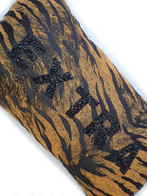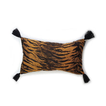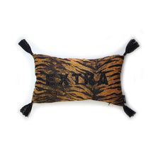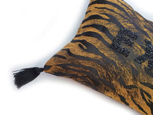 Hazeldee Home handmade black and orange Tiger jacquard cushion with black rhinestone embellished letters spelling 'EXTRA' and finished with bold silky black tassels.